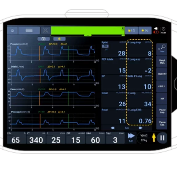 The 15” Monnal™ TEO screen allows the visualization and customization of 10 simultaneous monitoring pads, and curves. The evaluation of ventilation with the monitoring of VTe/PBW, Pplat, Ppeak, and Driving pressure (DP) on the main page, allows doctors and caregivers to have relevant information on the patient's condition.